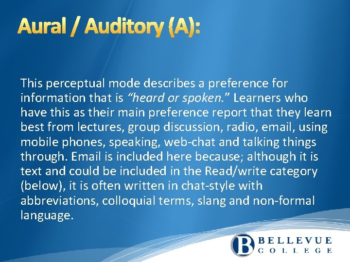 This perceptual mode describes a preference for information that is “heard or spoken. ” Learners who have this as their main preference report that they learn best from lectures, group discussion, radio, email, using mobile phones, speaking, web-chat and talking things through. Email is included here because; although it is text and could be included in the Read/write category (below), it is often written in chat-style with abbreviations, colloquial terms, slang and non-formal language.