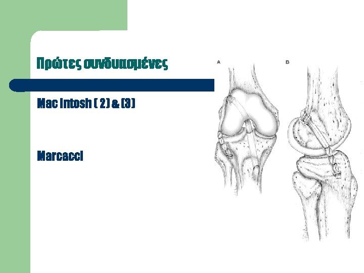 Εξωαρθρική τενόδεση Mac Intosh (1) 1972 Lemair 1967 & 1975 Losee΄s Ellison΄s + improves the anterior-lateral rotation of the tibia and lowers the risk of anterior subluxation of the lateral tibial condyle during rotational movements ( pivot ) - Does not decrease the anterior translation of the tibia