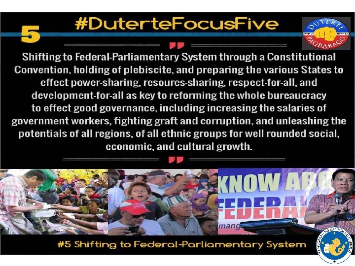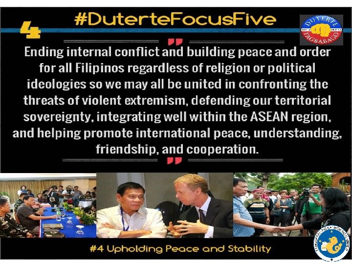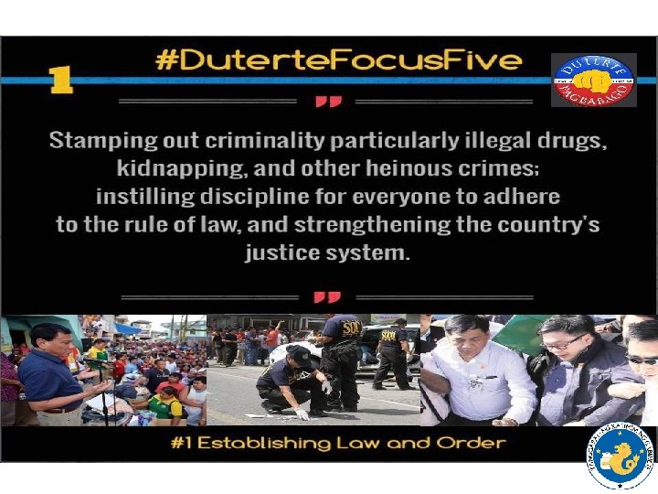 UPDATES • State of Lawlessness – Drug Campaign • 600, 000 surrenderees, 6, 000 drug pushers, 3 million involved in drugs • 3000 deaths either by operations or killings • Key Officials at the National and Local asked to Report and Explain – Bombing of Davao • Peace Initiatives – Unilateral Ceasefires declared CPP NPA and GRP – MILF Talks expanded to Include MNLF Misuari