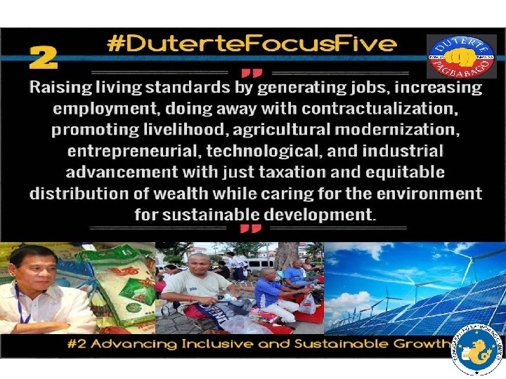 EMERGING 10++ SOCIAL DEVELOPMENT AGENDA 1. Promote rural development to ensure food selfsufficiency; 2. Ensure access to land property through democratization & post-land distribution support; 3. Enhance broad-based, sustainable livelihood and employment that are sector-specific and areabased; 4. Promote accessible, inclusive, nationalist, allencompassing and rights-based education; 5. Develop a culture-sensitive development program that advances artistic expression and strengthens Filipino Identity and Nationalism;