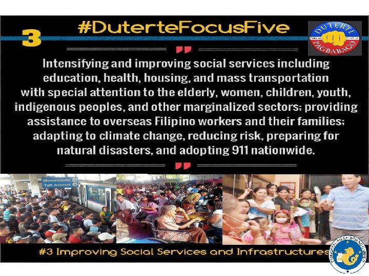THRUST OF THE CURRENT ADMINISTRATION “Love of country, subordination of personal interests to the common good, concern and care for the helpless and the impoverished – these are among the lost and faded values that we seek to recover and revitalize as we commence our journey towards a better Philippines” – President Duterte, Inaugural Speech, 30 June 2016 “Enduring peace can be attained only if we meet the fundamental needs of every man, woman and child. ” – President Duterte. First State of the Nation Address, 25 July 2016
