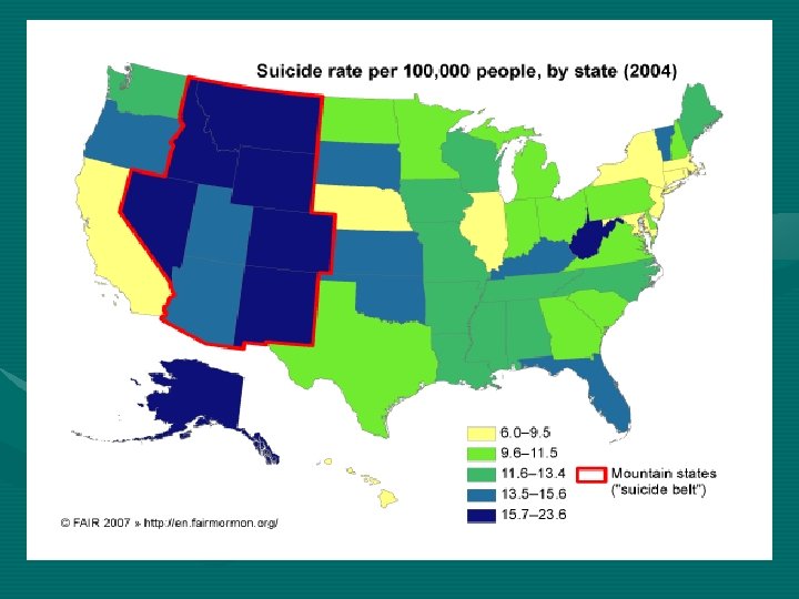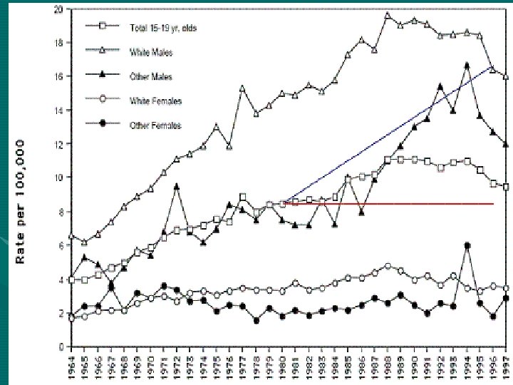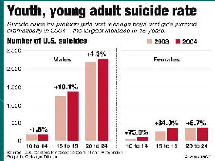 Teenage Suicide • Contributing factors include drug and alcohol use. • Suicide rate has more than doubled in the past 3 decades. Surgeon General (1997) said, “A youth suicide occurs every 2 hours in our country, 12 times a day, 84 times a week, well over 4, 000 times a year. ” 3 rd leading cause of deaths next to accidents and homicides for 15 to 24 year olds.