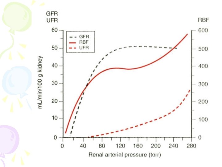 • A decrease in mean arterial pressure also decreases renal blood flow and eventually affects the glomerular filtration rate (GFR) when the pressure decreases to less than 60 mm Hg. • A persistently low mean arterial • pressure greater than 60 mm Hg affects renal blood flow, but does not affect the GFR because of the intrinsic mechanism of autoregulation