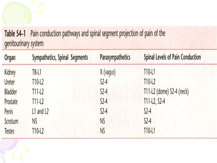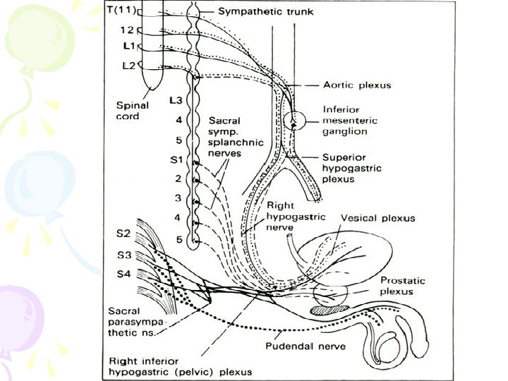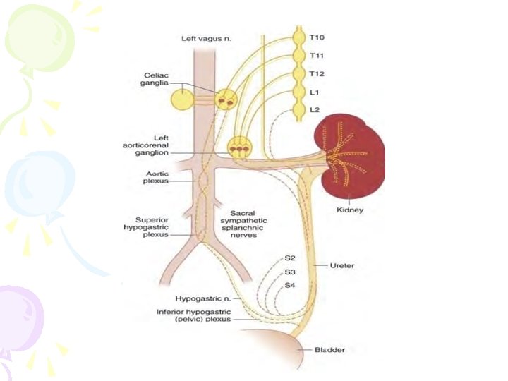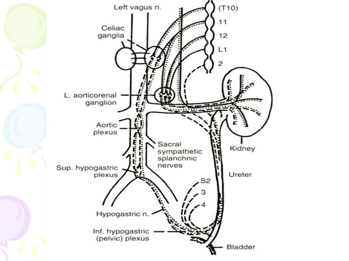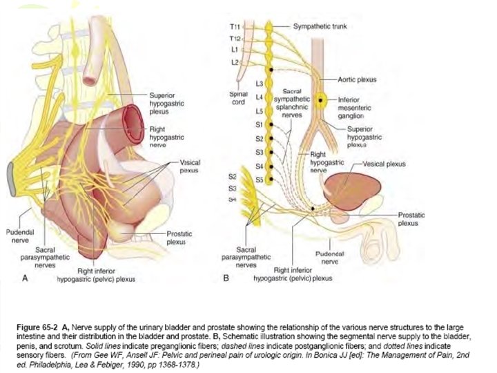 • The afferents carrying sensations of stretch and fullness of the bladder are parasympathetic, • whereas pain, touch, and temperature sensations are carried by sympathetic nerves. • Sympathetic fibers are predominantly a-adrenergic in the bladder base and urethra, and ß-adrenergic in the bladder dome and lateral wall.