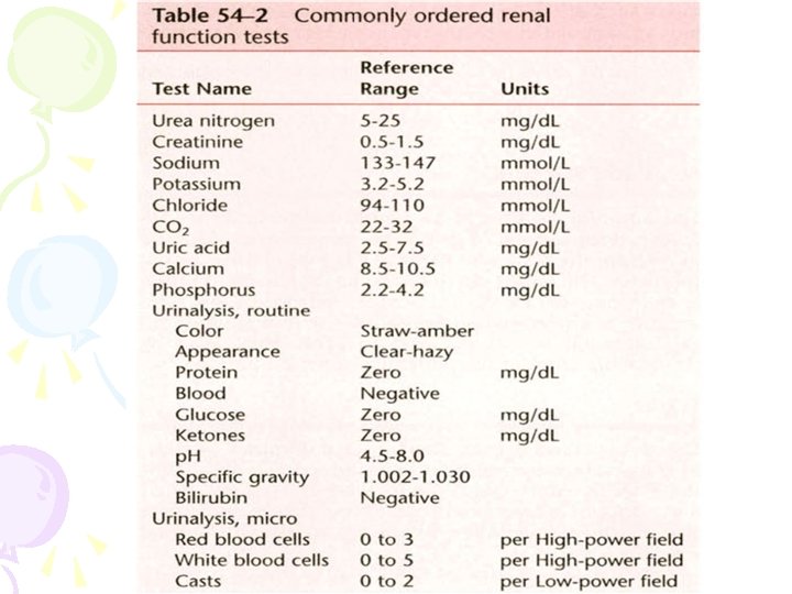 • Measurements of creatinine provide valuable information regarding general kidney function. • Creatinine in serum results from turnover of muscle tissue and depends on daily dietary intake of protein. • Normal values are 0. 5 to 1. 5 mg/100 m. L; values of 0. 5 to 1 mg/100 m. L are present during pregnancy.