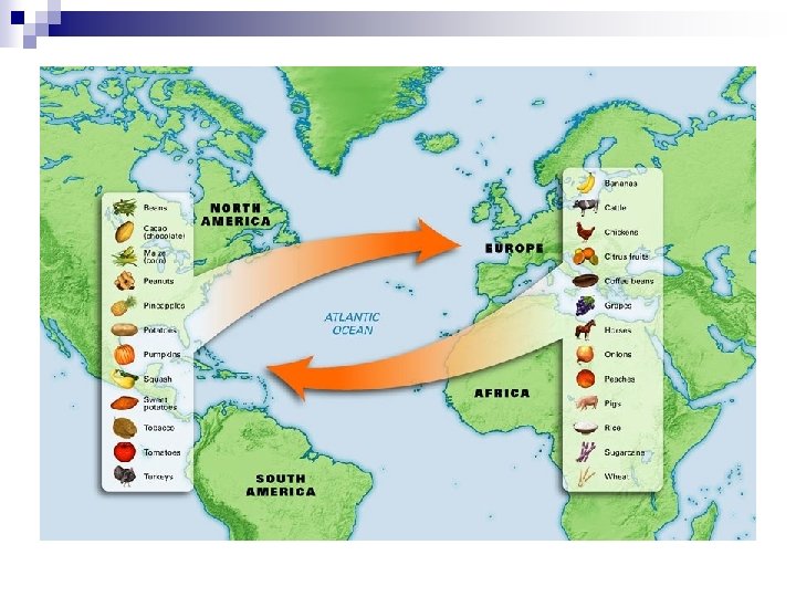 From Old World From Europe: n n Wheat, grapes, olives Horse, cows, pigs, chickens, sheep, goats, oxen From Asia n Silk, rice, spices (nutmeg, cloves, etc. )