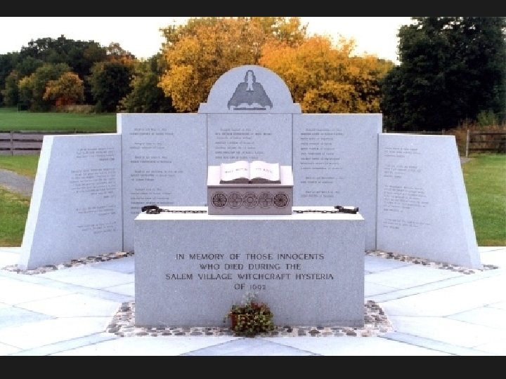 The Salem Witch Trials n n n n n Over 150 people accused Youngest/Oldest 4 -80’s Spectral evidence allowed in court (could only be witnessed by the accuser – the accused had no recourse) Only a confession could save you from the rope – A confession put your salvation in God’s hands 19 hanged, 1, Giles Corey, crushed to death 4 die in jail Accusation of members of prominence (i. e. the Minister’s or Magistrate’s wives) brought trials, finally, to a close Only one of the accusing girls ever apologizes Changed legal precedent to innocent until proven guilty