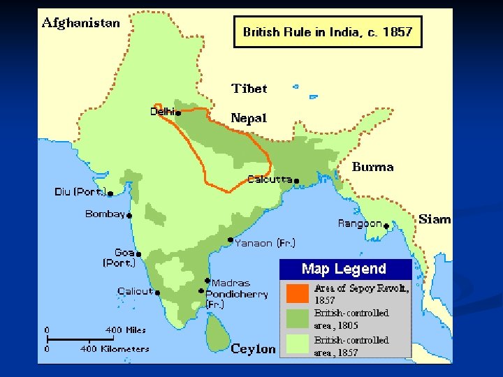 The Sepoy Rebellion n Indians Rebel n Sepoys refuse to use cartridges due to religious reasons n n n They had to bite them open – greased with pork fat Considered unclean by Muslims Many sepoys were jailed, others rebelled British put down the rebellion Results n n Britain takes direct control of India Increased distrust between Indians and British