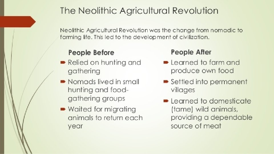 Two important terms to know • Nomad: Nomad a lifestyle where people, hunter gathers, must keep moving in order to find food. • Sedentary: Sedentary a lifestyle where people build permanent houses, start to domesticate animals and grow their own food.