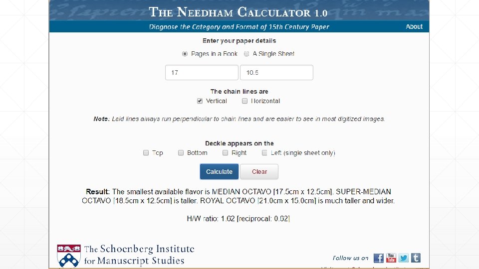 Paul Needham’s work on early printing paper ▪ Cataloguers should record page dimensions and should record the sheet size calculated from the format. ▪ The Needham Calculator : ▪ https: //schoenberginstitute. org/2017/01/30/the-needham-calculator -1 -0 -and-the-flavors-of-fifteenth-century-paper/ ▪ http: //www. needhamcalculator. net/