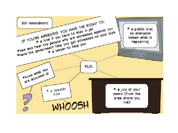 6 th Amendment • Right to a speedy trial by jury. – Must be informed of charges – Right to cross examination – Right to an attorney (Gideon vs. Wainright)
