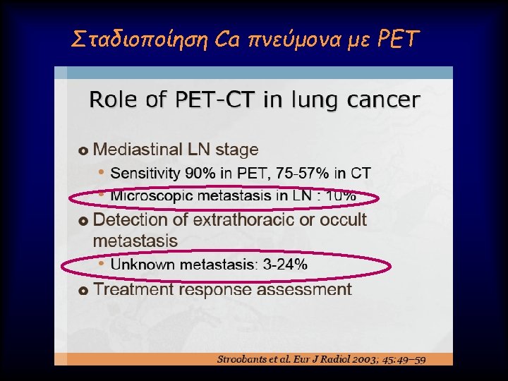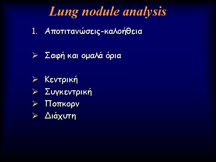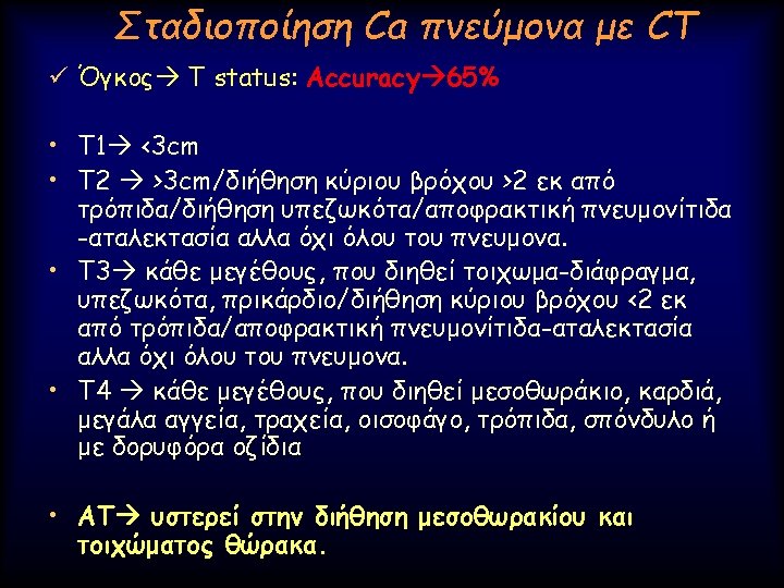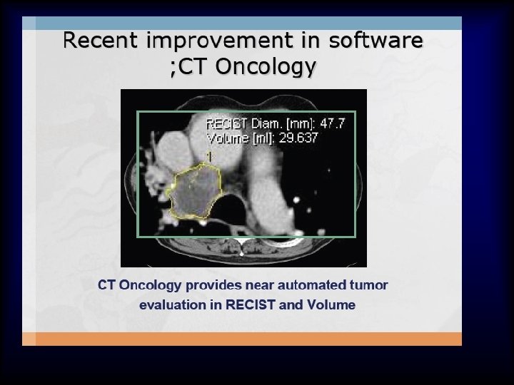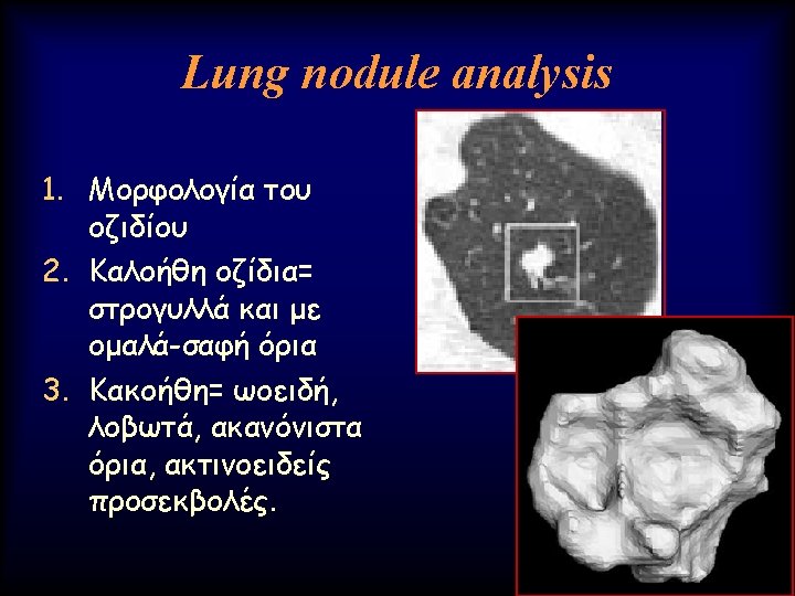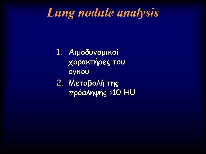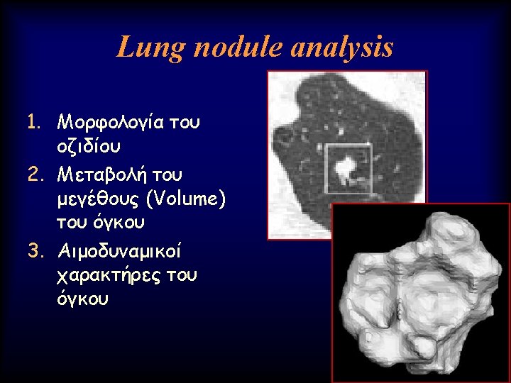 Advanced Lung analysis 1. Μεταβολή του μεγέθους (Volume) του όγκου Ø Γρήγορο doubling time Authors of a number of other series (20, 21) have confirmed similar findings and have estimated the median tumor doubling times, assuming a constant growth rate to be in the 160– 180 -day range.