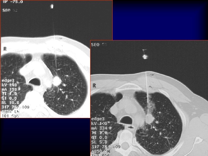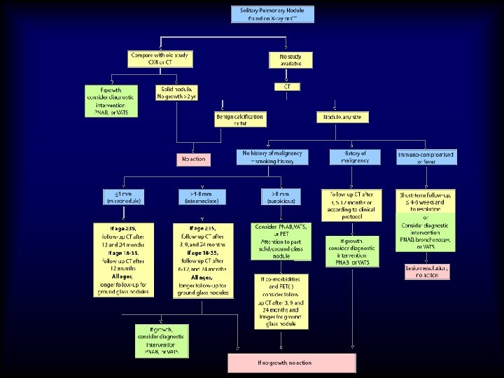 Lung nodule analysis • Evaluating Pulmonary Nodules Pulmonary nodules ≤ 4 mm have a low risk of being cancerous; • nodules between 4 -8 mm are of intermediate risk for cancer; follow up CT scans for both categories are recommended on different schedules • Pulmonary nodules >8 mm and mixed solid/ground glass nodules are suspicious for cancer; percutaneous needle aspiration biopsy (PNAB), positron emission tomography (PET), or video assisted thoracic surgery (VATS) should be considered