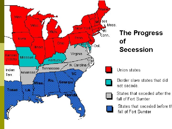 Lincoln’s Beliefs p No right to interfere with slavery where it existed p Secession illegal; Constitution formed by the people: no state can secede from the Union; Union is perpetual p No action until the South acts first