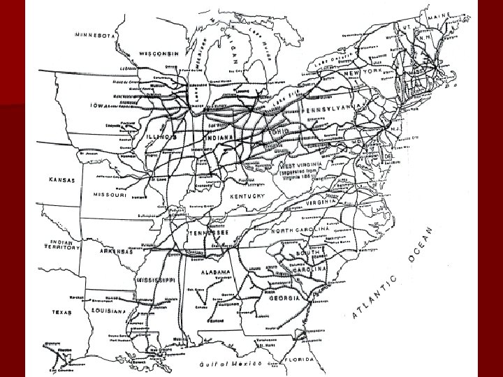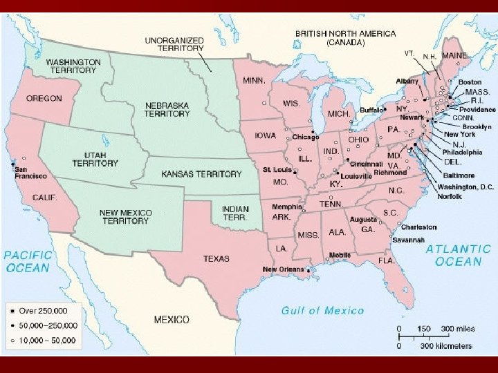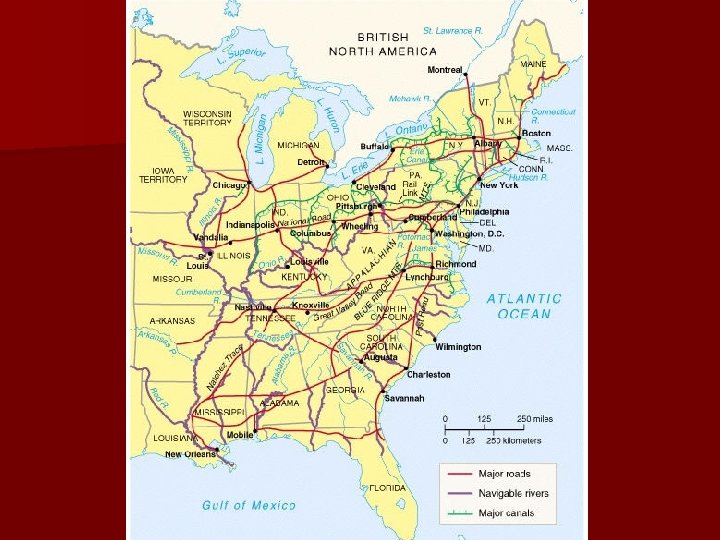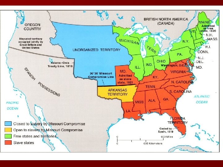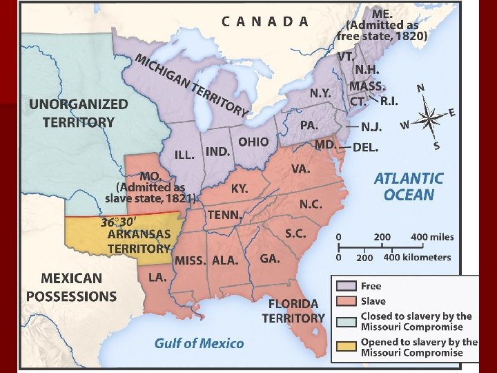 Early Decisions Regarding Slavery n Northwest Ordinance of 1787 – banned slavery west of Pennsylvania, north of Ohio River. n Constitution – Trans-Atlantic Slave Trade Over in 1807 – Fugitive Slave Clause n Missouri Compromise (1820) – Missouri admitted as slave state, Maine admitted as free state, slavery prohibited above 36 degree latitude line.