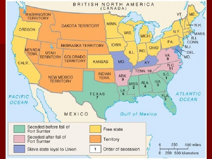 The Divided House Falls After Lincoln’s election South Carolina, Mississippi, Florida, Alabama, Georgia, Louisiana and Texas seceded from the Union. n The Confederate States of America n – President Jefferson Davis Three Options – (1) Compromise (2) Let seven states “go in peace. ” (3) Secessionist states could be compelled to return. n Fort Sumter – The Civil War Begins n