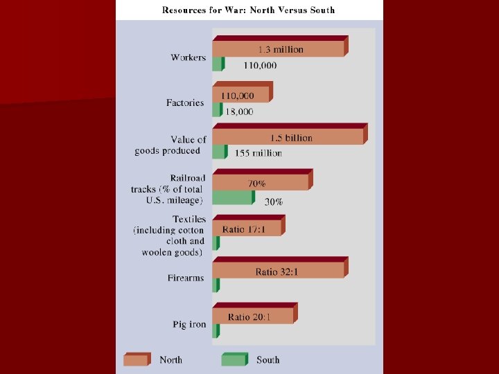 The Union Severed n Response to Fort Sumter n Balance of Resources n Border States – Lincoln/North – Lee/South – North – population, railroads, industrialization, shipyards, merchant fleet. – South – military leadership, agricultural resources, South fighting a defensive war. – Virginia, North Carolina, Tennessee, and Arkansas – seceded after Fort Sumter. – Maryland, Kentucky, Missouri – stayed loyal to Union. § Suspension of Habeas Corpus n Lincoln and Davis