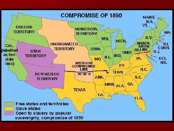 The Compromise of 1850 n The Compromise of 1850 – CA entered union as free state – Territorial governments were organized in New Mexico and Utah letting local people to decide whether to permit slavery. (Popular Sovereignty) – Texas-New Mexico border settled. – Slave trade, but not slavery, abolished in Washington, DC. – Fugitive Slave Act.