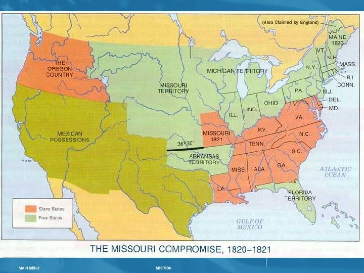The Missouri Compromise • Congress drew an imaginary line across the southern border of Missouri at latitude 36º 30´N. • Slavery would be permitted in the Louisiana Purchase south of that line. • Slavery would be banned north of that line except in Missouri • hey