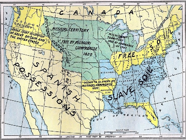 The Missouri Compromise • Congress drew an imaginary line across the southern border of Missouri at latitude 36º 30´N. • Slavery would be permitted in the Louisiana Purchase south of that line. • Slavery would be banned north of that line except in Missouri