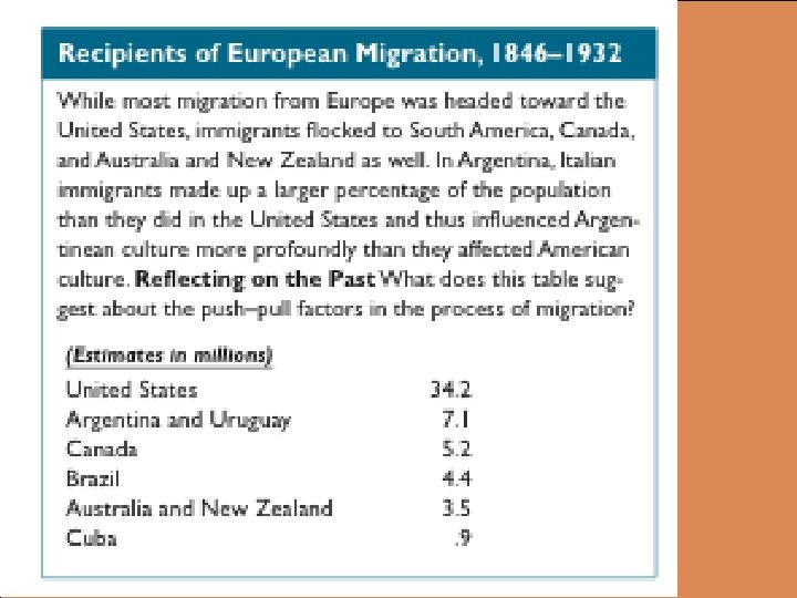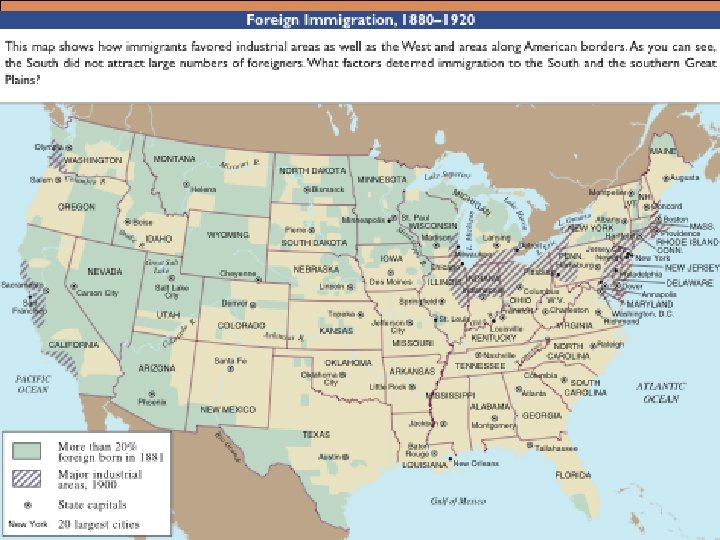 THE NEW IMMIGRATION, 1880 -1900 l 40 million immigrants came to the United States between 1815 and 1915 and another 20 million to Canada and Latin America – – l Over the course of the century, the sources of immigrants for the United States changed – – – l Three-quarters of those coming in the last quarter of the century stayed in the Northeast Many of the rest settled in cities across the country where they soon outnumbered native-born whites Until 1880, three-quarters of those coming to the U. S. (“old immigrants”) came from the British Isles, Germany, and Scandinavia By 1890, these nationalities were only 60 percent of the total with the rest (“new immigrants”) coming from southern and eastern Europe Italian Catholics were the most numerous followed by Eastern European Jews and then Slavs Large numbers were the result of cheaper, faster and better transportation – – – Dissatisfaction with life at home was basic to the decision to migrate Efforts to modernize European economies also stimulated immigration Government policies pushed others to leave Opportunity also lured thousands to the United States The phenomenon of immigrants being recruited through the reports and efforts of their predecessors is known as “chain migration”