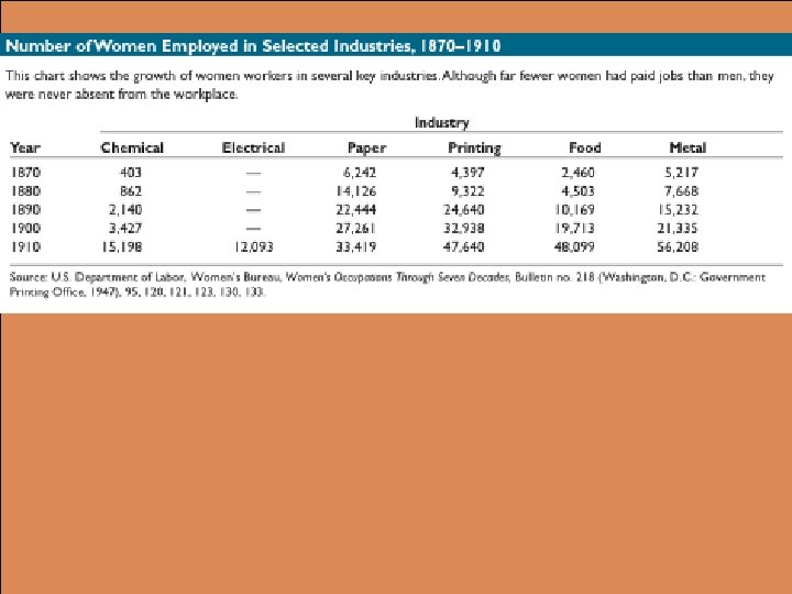 THE FAMILY ECONOMY l Children often worked outside the home – – l Even more children over the age of 14 worked, daughters as well as sons – l – – – l Young women from immigrant families were more likely to work than were young American women. By 1900, nearly 20 percent of American women were in the labor force – l In 1880 one-fifth of the nation’s children between 10 and 14 held jobs Child labor was closely linked to a father’s income, which depended on skill, ethnic background and occupation Employed women earned far less than men By the 1890 s, office work, nursing and clerking in department stores offered young women attractive opportunities Ethnic taboos and cultural traditions helped shape choices Domestic service was arduous and dominated by Irish, Scandinavians and blacks Dismal job choices drove some women to prostitution which increased in the late nineteenth century Late nineteenth century working class families operated as cooperative economic units – – Housework was time-consuming and arduous Married women bore managed the family resources Women also supplemented family income by taking in work Black women worked outside the home both before and after marriage, mostly as domestics or laundresses