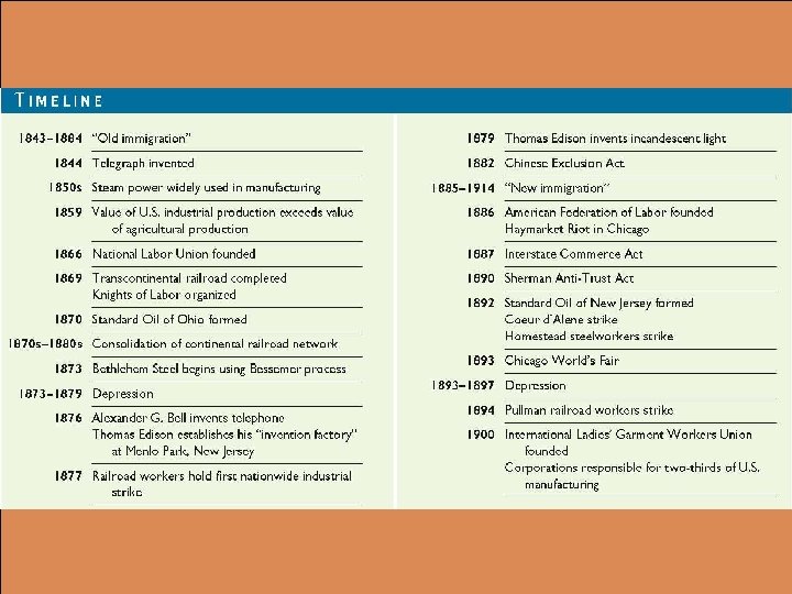 THE CHANGING NATURE OF WORK l The rise of big business, characterized by mechanization and mass production, changed the size and shape of the workforce and the nature of the work itself – l More and more Americans became wage earners with the fastest expansion in the unskilled and semiskilled ranks Need for skilled workers remained because new positions appeared as industries expanded and changed – – All skilled workers faced the possibility that technical advances would eliminate their jobs or that employers would hire unskilled workers to take over parts of their jobs New methods of production and organization undermined the position of skilled workers