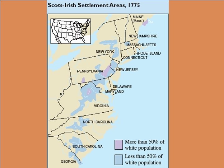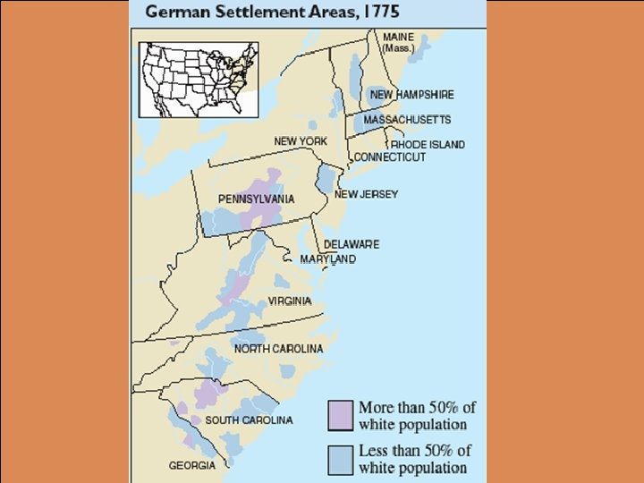 THE NORTH: A Land of Family Farms l l New England strove to maintain homogeneity by making immigrants unwelcome Mid-Atlantic colonies swarmed with immigrants from the Rhineland Ireland – – 90, 000 Germans (mostly in families) came in during eighteenth century fleeing famine, war and pestilence and settling where promoters promised cheap and fertile land, low taxes and no military service Even more Scots-Irish arrived, settling in New York, Pennsylvania, and the mountain valleys of the Carolinas and Georgia