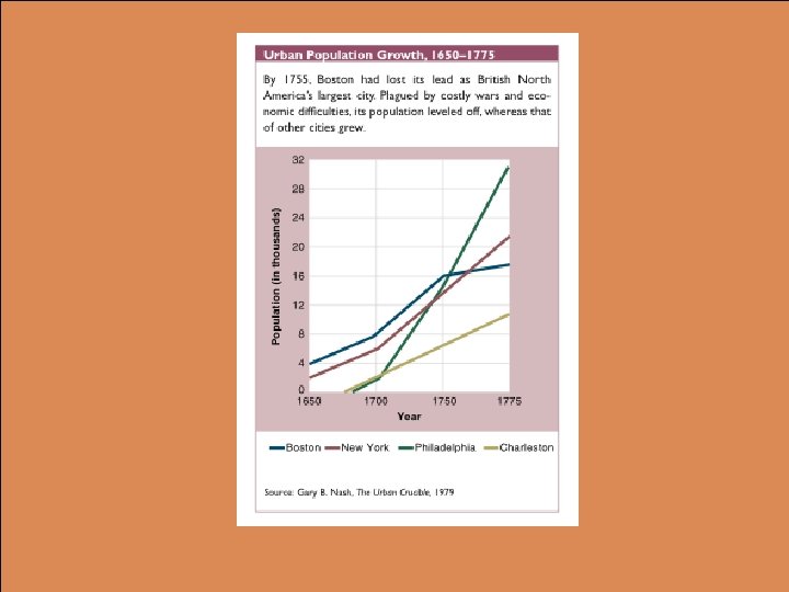 THE URBAN WORLD OF COMMERCE AND IDEAS l Only 5% of eighteenth century colonists lived in towns as large as 2500 people – l No city had more than 16, 000 people in 1750 or 30, 000 in 1775 Urban societies were on the cutting edge of transition to “modern” life – – – Barter economy gave way to commercial economy Social order based on assigned status gave way to one based on achievement Rank-conscious, deferential politics changed to participatory and contentious politics Small scale artisanship was replaced by factory production. European ideas radiated out to hinterland