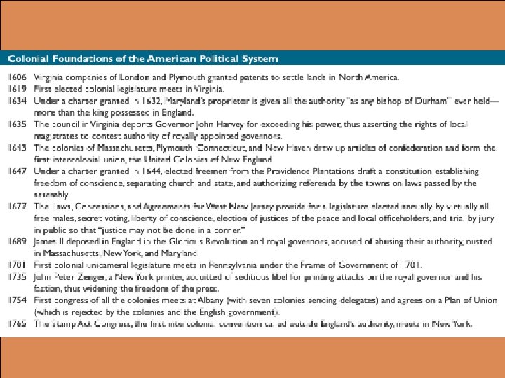 STRUCTURING COLONIAL GOVERNMENTS l In England ownership conferred political rights – – – l Colonists (with exception of Massachusetts which had religious requirement until 1691) generally followed this rule 40 shilling freehold requirement allowed 50 to 75% of adult free males to vote As proportion of landless increased in eighteenth century, franchise contracted Notion that powerful and wealthy should hold main political positions balanced by belief that entire electorate should periodically judge their performance