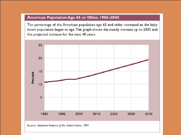 AGING AND ILLNESS l l The population of America continued to live longer and healthier lives as the century concluded Many older Americans objected to mandatory retirement rules – – – l l 1978: retirement age was raised from 65 to 70 1986: amendments to the Age Discrimination in Employment Act prohibited mandatory retirement on the basis of age 2005 Supreme Court ruling held that a worker suing to reverse age discrimination did not have to prove the employer acted intentionally As the population aged, there were increasing problems keeping the social security system solvent Alzheimers increasingly affected the aging population while AIDS struck all ages and all countries, especially in Africa – In 2003 President Bush committed the United States to triple its commitment over the next 5 years to try to counter AIDS in Africa
