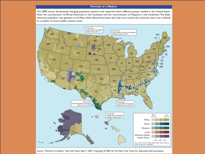 THE CENSUS OF 2000 l 2000 Census reported a 13 percent increase in the nation’s population for a total of 281. 4 million people – – l Rate of growth accelerated in the 1990 s as a result of immigration and longer life expectancy with the total US population reaching 190. 8 million in 2003 Growth was greatest in the West U. S. remained 69 percent white, 12 percent African American and 11 percent Latino Nationally the Asian and Pacific Islander population increased by 43 percent while whites were no longer the majority in California Many Americans in the 2000 Census wanted to identify themselves as multiracial