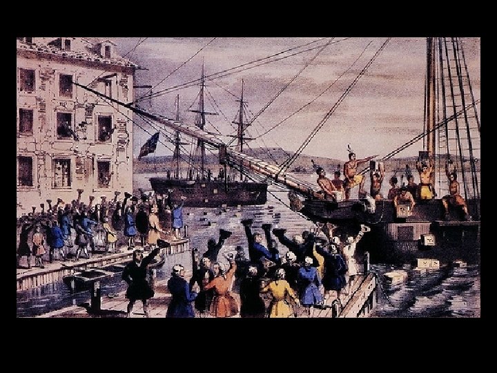 XI. Response to Tea Act a) Lead by the Sons of Liberty, the colonists refused to allow any ship from the East India Tea Co. to land in colonial harbors. b) Boston, Sons of Liberty dressed as Indians and dumped the tea from the ships into the harbor. Became known as the Boston Tea Party c) ‘tea parties’ began in other colonies including Charlestown, South Carolina.