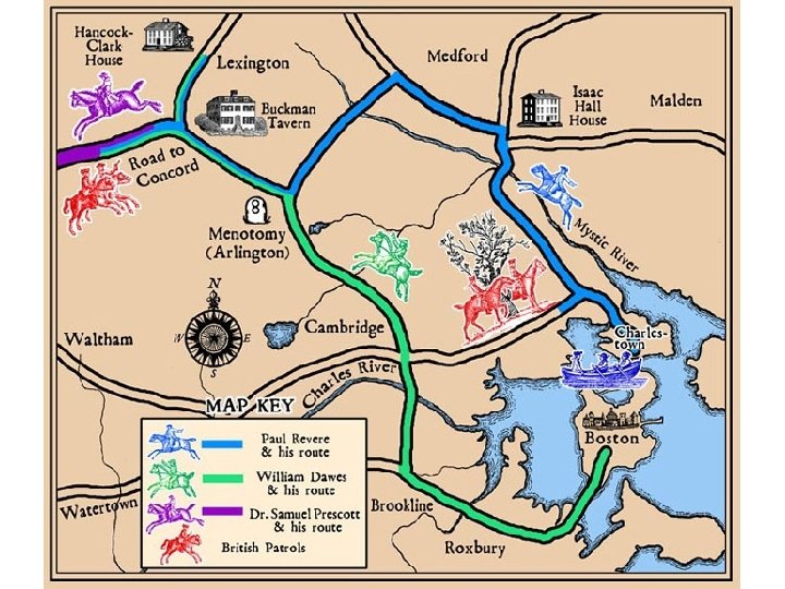 The Midnight Ride • On the other side of the river, Paul Revere and another patriot, William Dawes, rode in different directions to try and warn John Hancock and Samuel Adams that the British were on their way to arrest them. • They also wanted to tell the colonists in the towns of Lexington and Concord that the British soldiers were on their way – “The British are coming!” The two men raced on their horses through the countryside, warning minutemen that the Regulars were coming! •