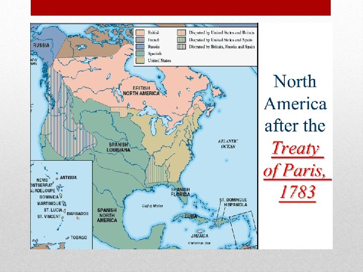• The Treaty of Paris in 1783 ended the American Revolution • The treaty gave America: • Full independence • All territory east of the Mississippi River, between Canada & Florida • The removal of the British army from U. S. claims in America The Treaty of Paris