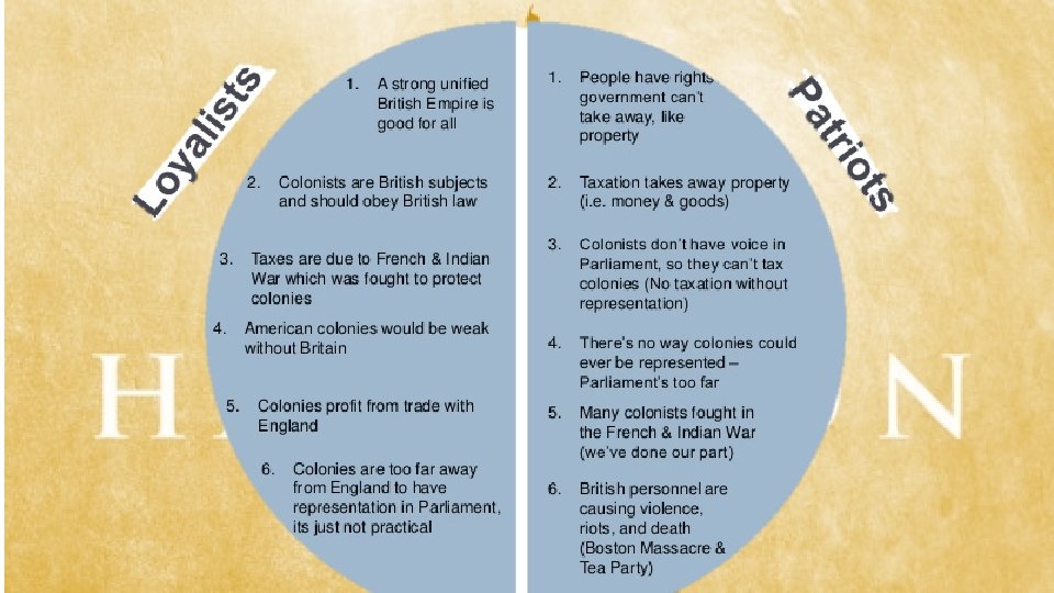 PATRIOT: Alexander Hamilton • Founding Father of America • Joined forces with the Patriots in their protest of British-imposed taxes • Defended the actions of the First Continental Congress with essays A Full Vindication of the Measures of Congress (1774) and The Farmer Refuted (1775) LOYALIST: Samuel Seabury • Against all unlawful congresses and committees (like the Continental Congress) • Wrote "Free Thoughts on the Proceedings of the Continental Congress" bashing their work • “If I must be enslaved, let it be by a KING at least, and not by a parcel of upstart, lawless Committeemen. ”