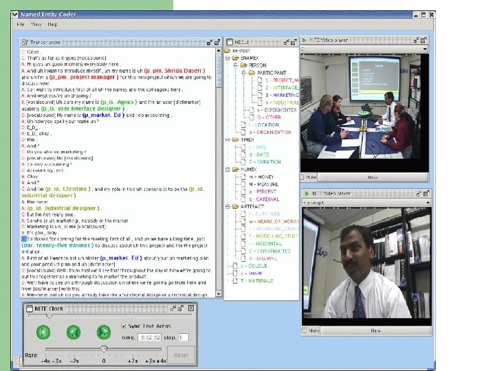 Annotations timestamping against signal – emotion coding; head gestures; hand gestures focusing on addressing and interactions with objects; location in room; gaze orthographic transcription with word-level timings derived by forced alignment discourse structure over orthography – dialogue acts w/ addressing, named entities, topic segments, decision phases, extractive summaries linked to participant abstractive summaries