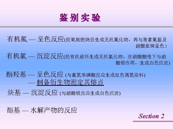 Identification tests Organic fluorine — Color reaction(with alizarin complexone and Cerous nitrate after destroyed by oxygen flask combustion ) Organic chlorine — Precipitation reaction(with nitric acid and silver nitrate after destroyed by oxygen flask combustion) Phenolic hydroxyl — Color reaction (diazobenzenesulfonic acid) — Melting point determination of derivatives Alkynyl group — Precipitation reaction(with silver nitrate) Ester group — Hydrolysis product reaction Section 2