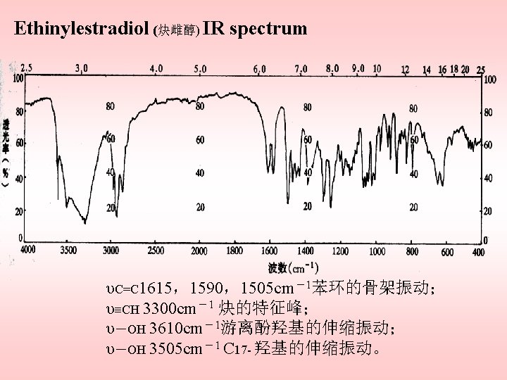 Infrared spectrophotometry Assignment location wavenumber (cm-1) comments –OH stretching everywhere ~3600 a CH 2 &CH 3 stretching everywhere 2970~2850 b =C–H stretching aromatic ring 3040~3010 ≡C–H stretching ~3320 aliphatic ketone stretch hexa-type ring 1720~1705 c five-membered 1749~1742 C 20- 1710~1706 –OCOCH 3 everywhere 1742~1735 –C=C–C=O hexa-type ring 1684~1620 d (Δ 4– 3 – keto) 1585~1620