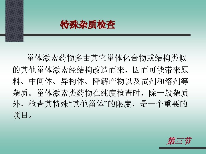 The Specific Impurity tests Steroid hormone drugs are obtained by modifying other steroid compounds or other structurally relative steroid hormones. Impurities, such as raw materials、intermediate compounds、isomers、degradation products 、 reagents and solvents etc, may be introduced into their final products. Except for general impurities, the limit of other steroids is also an important item in the purity tests. Section 3