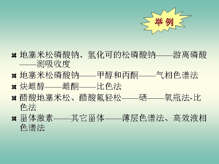 Examples Dexamethasone sodium phosphate、hydrocortisone sodium phosphate——free phosphonic acid —— determination of A Dexamethasone sodium phosphate——methanol and acetone——GC Ethinyloestradiol ——estrone ——colorimetry Dexamethasone acetate、fluocinonide acetate—— selenium——OCF-colorimetry Steroid hormones——other steroids——TLC、 HPLC