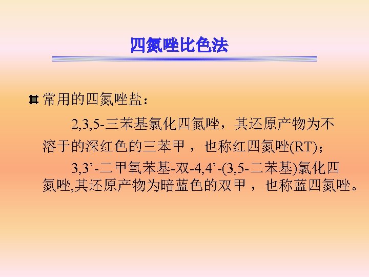 Tetrazoline colorimetry Commonly used tetrazoline salts: Red tetrazoline(RT) : 2, 3, 5 -triphenyltetrazolium chloride (TTC); Blue tetrazoline(BT): {3, 3’-dianisole-bis[4, 4’-(3, 5 -diphenyl) tetrazolium chloride]}