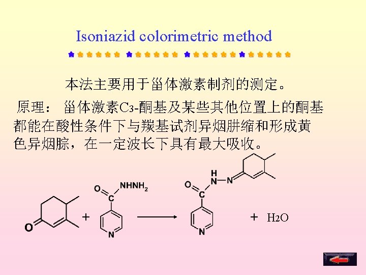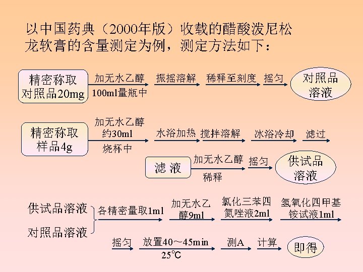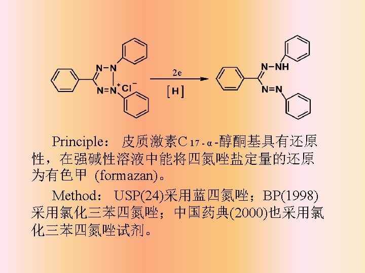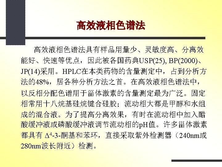 Specific impurity tests: Dexamethasone sodium phosphate、hydrocotisone sodium phosphate— free phosphoric acid — determination of A Dexamethasone sodium phosphate—methanol and acetone—GC Ethinyloestradiol — estrone — colorimetry Dexamethasone acetate —selenium Steroid hormones——other steroids——TLC、HPLC Assays: Tetrazoline colorimetry Isoniazide colorimetric method Cober reaction colorimetry HPLC