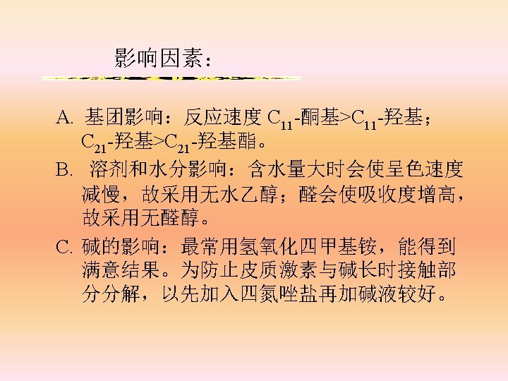 Influence factors: A. Functional groups They often influence the rate of reaction : C 11 -keto>C 11 hydroxy;C 21 -hydroxy>C 21 -hydroxyl ester。 B. Solvent and moisture Water will slow down the rate of color reaction, we use non-aqueous ethanol as the solvent instead of water. As aldehyde will make the absorbance high, we use nonaldehyde ethanol. C. Alkaline reagent D. Tetramethyl ammonium hydroxide is commonly used for a satisfied result. E. Notice: add tetrazoline salt first and then alkaline solution to prohibit the decomposition of corticosteroids.