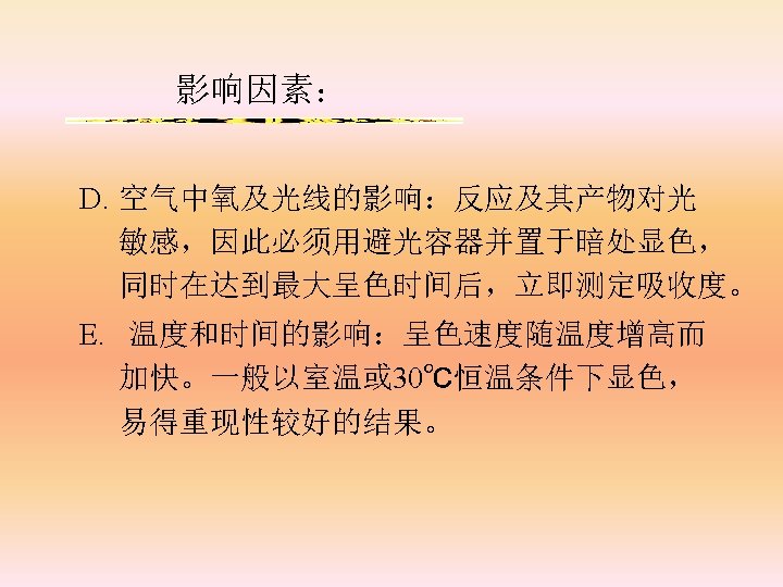 Influence factors: D. Oxygen and light E. Because reaction products are sensitive to the ray, photophobic container is needed and placed in the dark. Immediate determinationis needed. E. Temperature and time Higher the temperature is , faster the rate of color reaction is. Generally, room temperature or 30℃ constant temperature is the best condition. The result has a better repeatability.