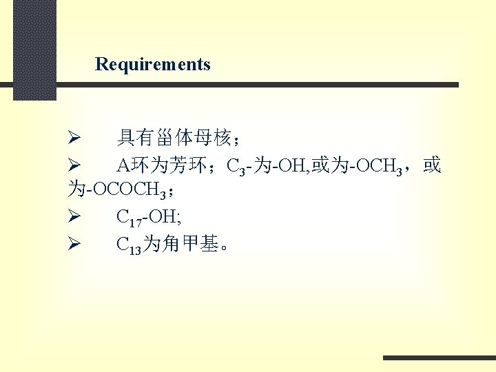 Fundamental requirement: Ø 掌握各类甾体激素药物的基本结构特点、鉴别 实验及含量测定方法; Ø Mastering the general structure characteristics、 identification tests and assays of steroid hormones; Ø 熟悉HPLC在鉴别试验及含量测定中的应用; Ø Familiarizing with the application of HPLC in identification tests and assays; Ø 掌握IR在甾体激素类药物鉴别中的应用。 Ø Mastering the application of IR in identification tests.