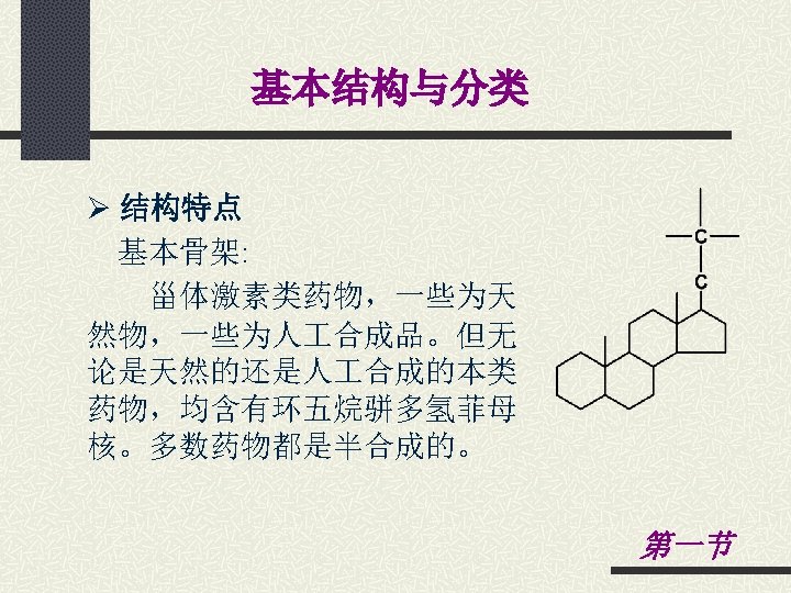 The main contents: Ø 甾体激素类药物的基本结构特点与分类 Ø The structure, characteristics and classification; Ø 甾体激素药物的鉴别试验 Ø The identification tests; Ø 甾体激素药物的特殊杂质检查 Ø The specific impurity tests; Ø 甾体激素药物的含量测定 Ø Assays.