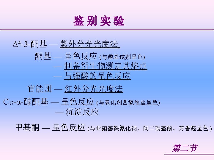 Identification tests Δ 4 -3 -keto — Ultraviolet spectrophotometry Ketone group — Color reaction (with carbonyl reagents) — Melting point determination of derivatives — Reaction with strong acids Functional group — Infrared spectrophotometry α-hydroxyacetone — Color reaction(with tetrazoline salt) — Precipitation reaction Methylketone group — Color reaction(with sodium nitroferricyanide , m-dinitrophenol, aromatic aldehyde ) Section 2
