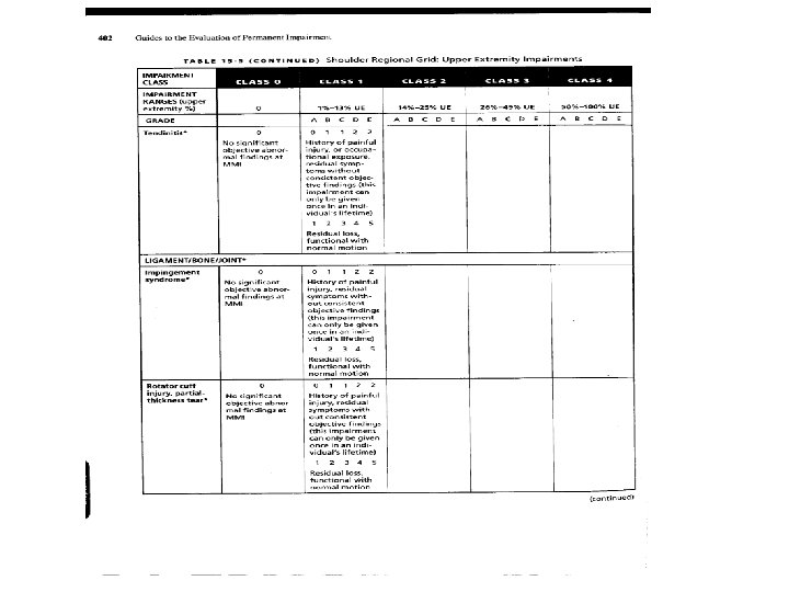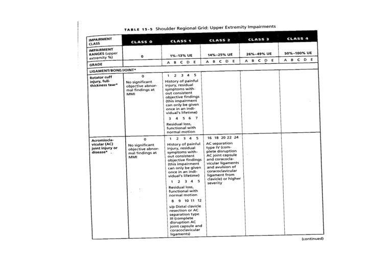 Full Thickness Rotator Cuff Tear Shoulder Regional Grid: Upper Extremity. Table 15 -5, page 403. Either class 0 or class 1 (0% or 1 -7%) ranges. Class 1 – Default 3 or 5%. 8 -13% impairment is not available for full thickness rotator cuff tear. • Classes 2 - 4 also not available. • • • * Only exception is where loss of range of motion present, then option to use Section 15. 7 or with AC joint/distal clavicle resection.