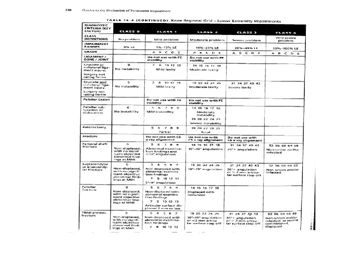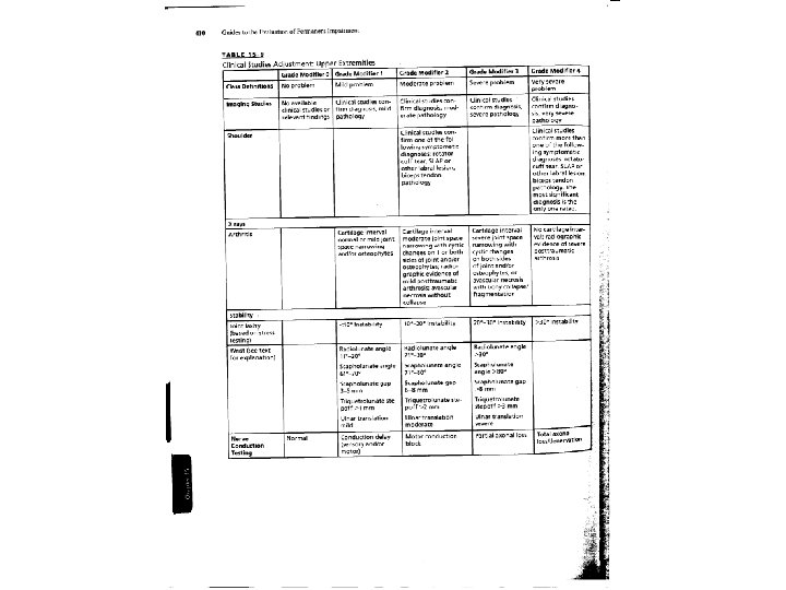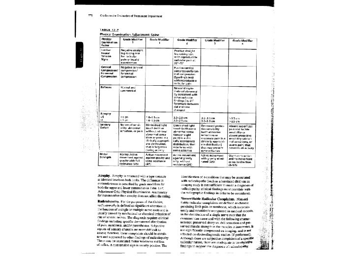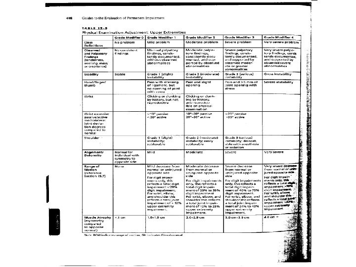 Grade Modifier #2 – Physical Examination • For upper extremity injuries, Table 15 -8, page 408. (see attached) • For lower extremity injuries, Table 16 -7, page 517. • For spinal injuries, Table 17 -7, page 576. (see attached)